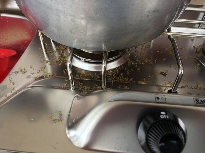I tried to cook but even with the light off the mosquitos were flocking to the flame. I eventually abandoned cooking and settled for bread for dinner inside. With beer of course because I needed it. But before I could eat I had to manage the mosquitos inside. I had a fly swatted but it just wouldn’t do it. I ended up killing them by swatting them with a hand towel, which left a mosquito graveyard on the bed.