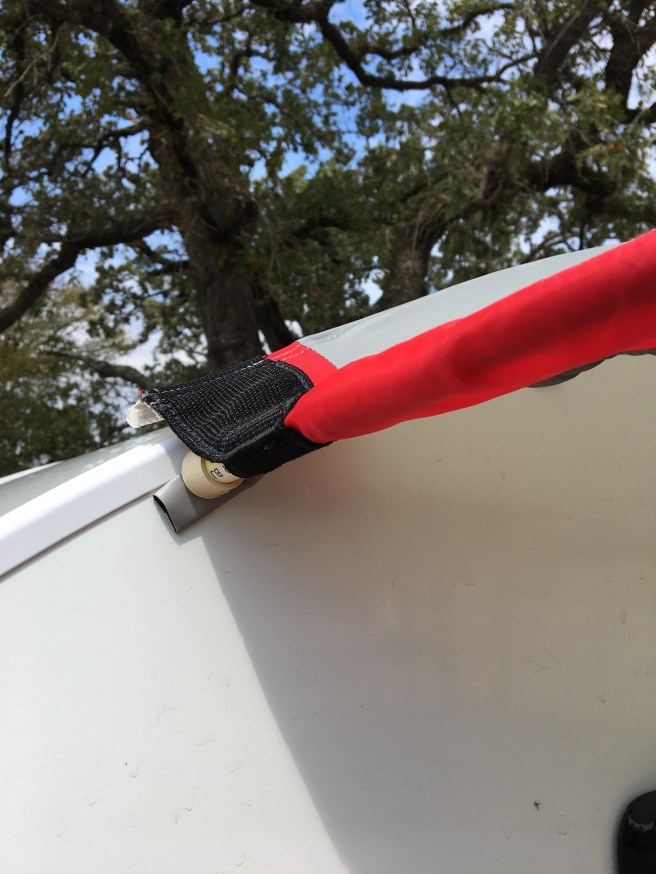 Once I had the basics I started looking for a way to fix the visor. Before I left, I discovered the problem was that the pole that is supposed to provide tension to hold it up was about 8″ to short. After wondering around Lowe’s looking at stuff I decided to try a small diameter PVC pipe to extend it.