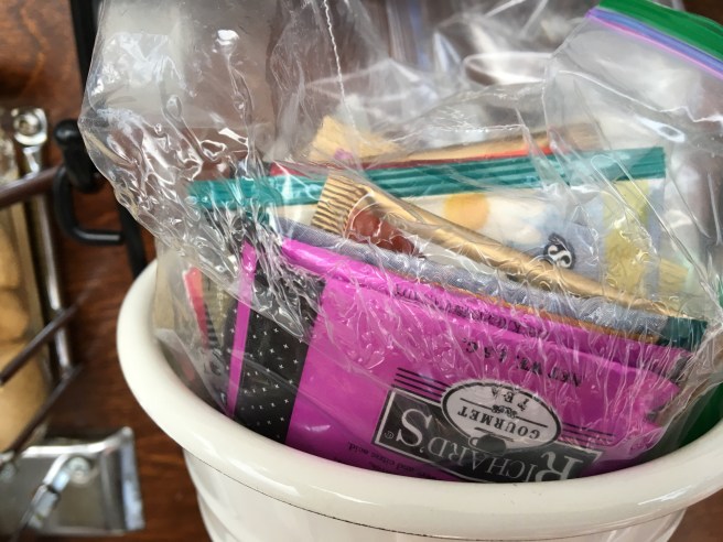 The weather was wonderful and cool for a change, so I opened all the windows to get a breeze and started setting up the kitchen to dinner. I started a loaf of bread baking in the toaster oven, while I set up the pop up changing tent and water heater. Then it got dark enough to turn on lights……..and here came the mosquitos.