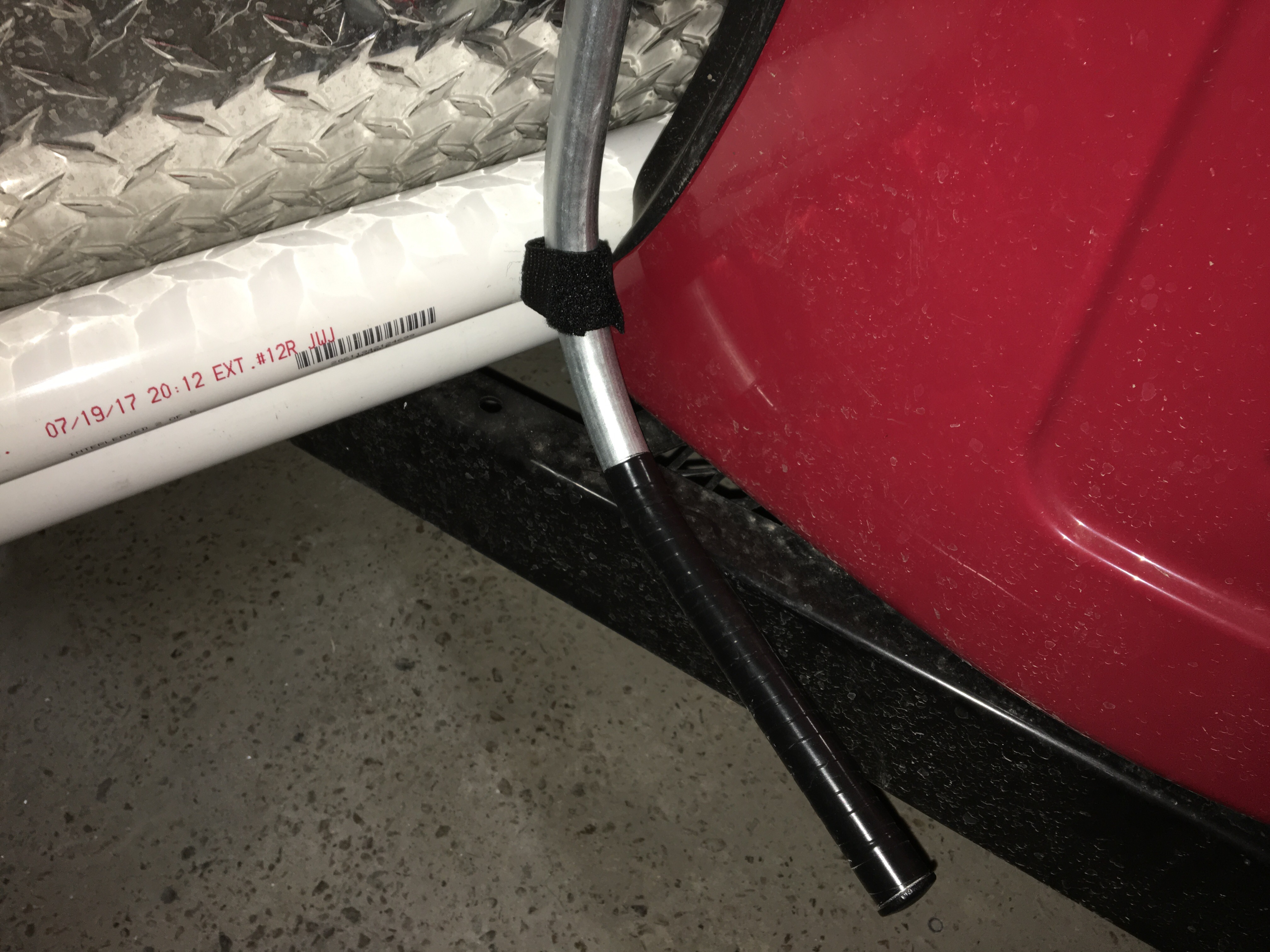 These pipes also provided me a way to mount the shower curtain rod so it doesn’t have to ride in the truck. I added straps with Velcro to the pipes to secure it at the bottom.