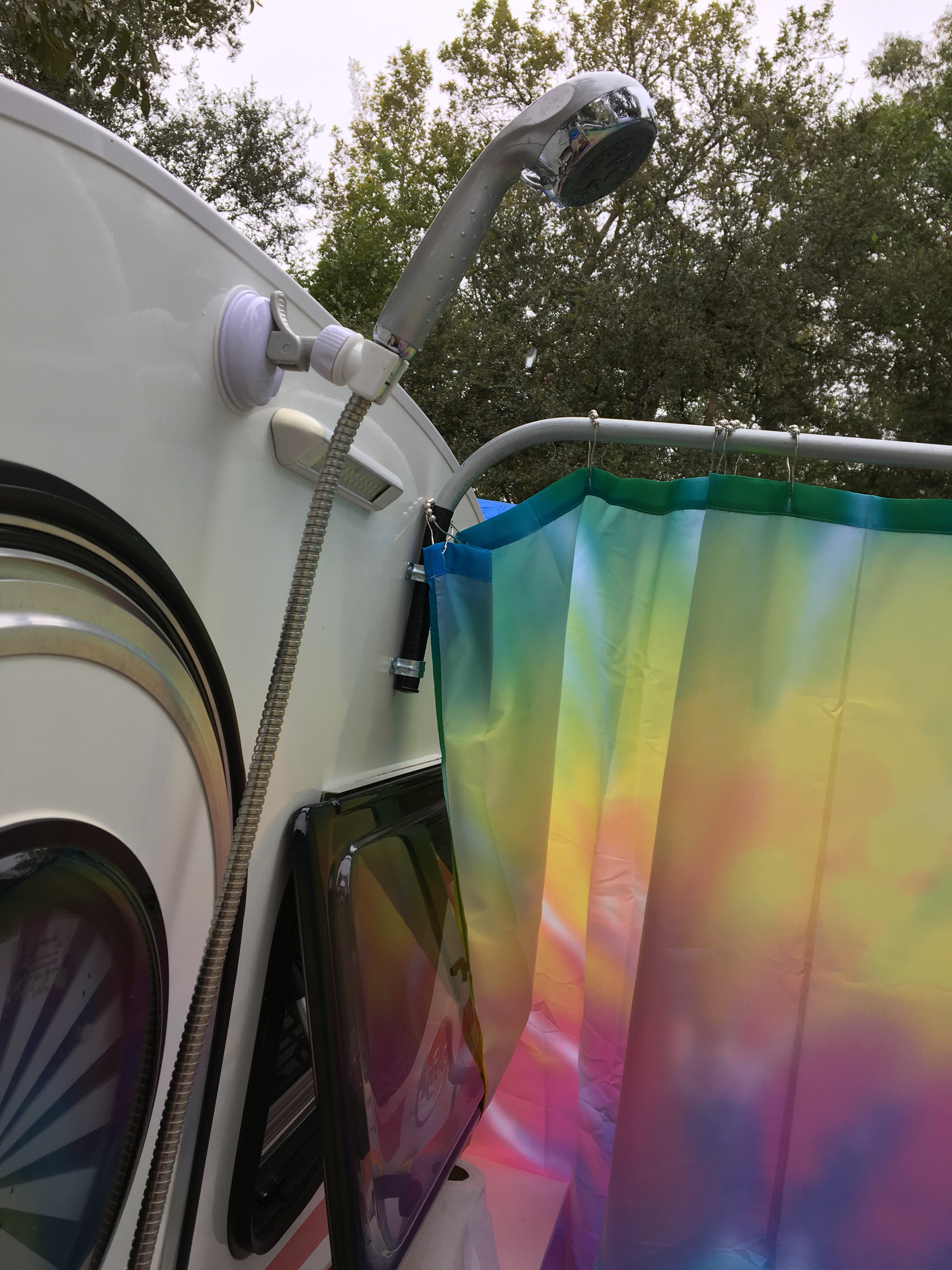 After my second trip I searched for a way to mount it & I finally figured out I could use a screw already on the camper to hang it from. This finally allowed me to get a hot shower. It was a hallelujuh moment when I turned on the water and I heard the click of the ignitor and then the “whoosh” of the heating element coming on.