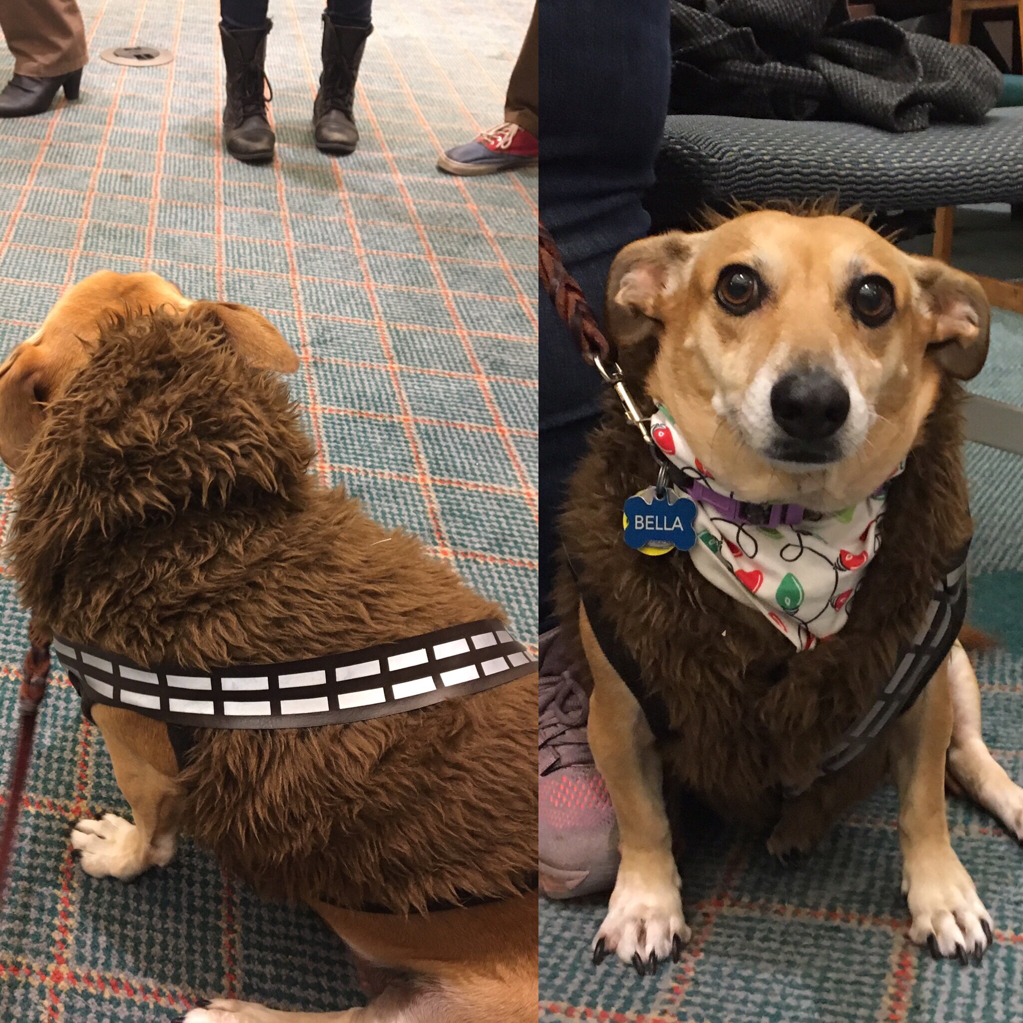 Even though she was grouchy we had to go out Thursday night because she is a therapy dog and we had a visit to Rice University for finals. In order to get her to go out I had to bundle her up in her Chewbacca coat and she rode the whole way there with her nose buried in my scarf. I guess she going to need a scarf of her own.