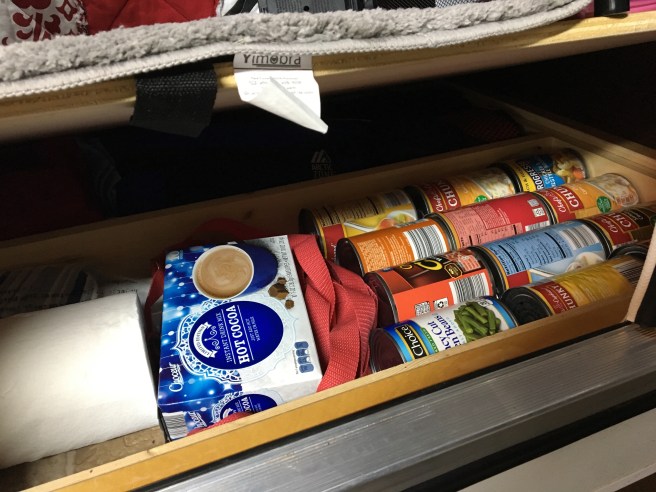 I am also planning to carry plenty of food on my trip to minimize time searching for grocery stores. I discovered I can fit quite a bit of canned soup and vegtables under the bed.
