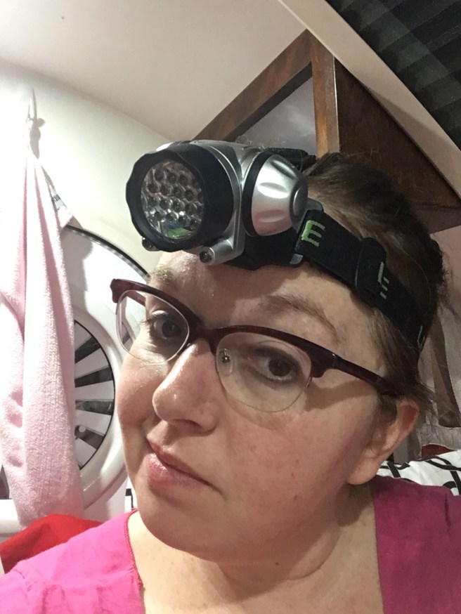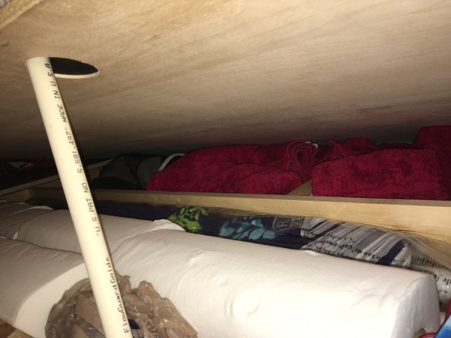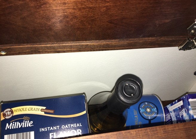When I was working on packing to maximize storage and accessibility I spent around 30 minutes trying to make things fit in the cabinet at the head of the bed so that it would close. This was already where I put towels and extra toilet paper to get to easily from the door that the shower curtain rod surrounds. I figured it was also the best place for food and water and it was really the only place I thought I could put wine without the fear of the bottle getting broken. After a long time of rearranging, I finally asked the question “why am I struggling to make this close?” There really was no reason to close it. I don’t really need it as a shelf since I changed out the bed for a twin and have the side table. I had been working to discipline myself not to put much on it anyway because it was such a hassle to get it open if it did have anything on it. So I gave up and decided to just leave it open.
