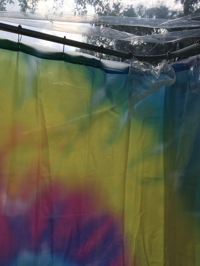 I also worked on covering it to keep rain out. My first idea was to use an umbrella and I bought a sport brella made to attach to folding chairs with an adjustable arm that I thought would cover the whole area. After getting it I discovered that the measurements online were to the tips of the braces, not the actual coverage. When I discovered this I decided to just use one of my extra shower curtain liners to cover the top and used binder clips to hold it in place. It worked wonderfully for a shower, but when it started raining there was no way to get the top liner tight enough to keep the water from collecting in the middle & weighing it down. So I settled on a combined solution using both.
