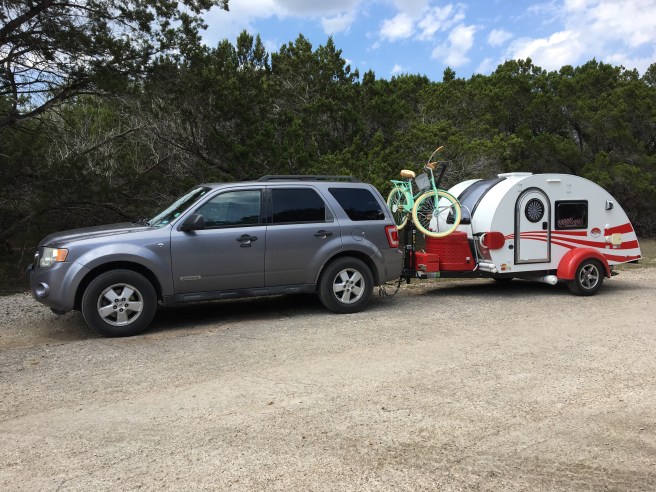 I am overall feeling very optimistic about my long trip now. I know I can carry most of what I need and my Escape did a great job of pulling it. I really tested it’s capabilities on the road to the campground that turned out to be like a roller coaster, narrow, no shoulder with sharp turns and steep hills, often occurring together. The only noticeable difference was the gas mileage. I was getting around 19-20 mpg but with it loaded it only got 16 mpg. It ran well pulling it though, and even when I was pushing it to get up hills to try to keep a somewhat steady pace since I had a parade of cars behind me, it only got up to around 3500 rpms.