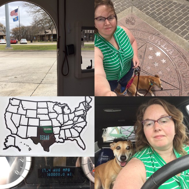 Since I left earlier than planned I made the most of the rest of the day as I traveled to Oklahoma City. The camper did help make it a more leisurely trip since I could stop and eat lunch in the camper and relax. We also stopped and took pictures at the state line and I rolled over 160K mikes in the Escape. At this point on the tip Bella was still enthusiastic about going somehwere.