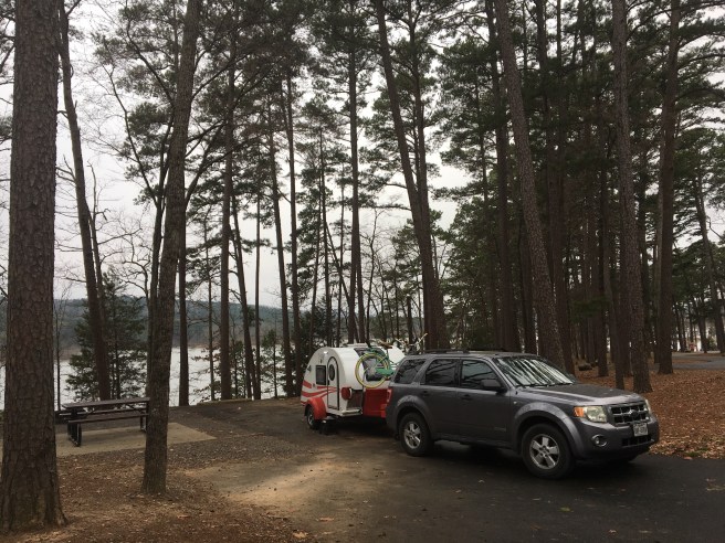 I started my 2018 road trip and first multi state trip with the teardrop a week ago. Due to last minute things at work and a need to conserve vacation days ended up leaving after work on Thusday. My first stop was the Lake Tawakoni RV park in Point Texas with my Thousand Trails pass. I don’t recomend this campground. The only positives for the night were that I was right acoss from the bathroom and I tested my boondocking skills.