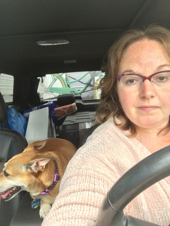 By this point in the trip Bella finally decided to stop trying to stand on the console.  I think the constant up and down was tiring, but she was still not getting off completely. She still needed to see where we were going.  You know in case she did not approve.