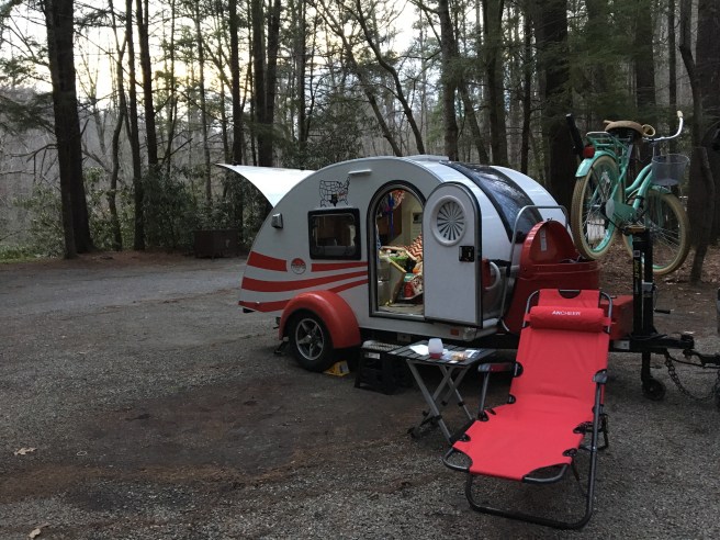 Overall the T@G worked great off grid.  All the tent campers came by to tell me how jealous they were of my full kitchen and lights.  The porch lights are amazing and you can really see that in a place that truly gets dark.  The inverter I got was able to handle my electric blanket and I turned it on a little before dark in the hopes of keeping the inside from getting too cold. It worked well and between it and the extra blankets I packed, we slept great.
