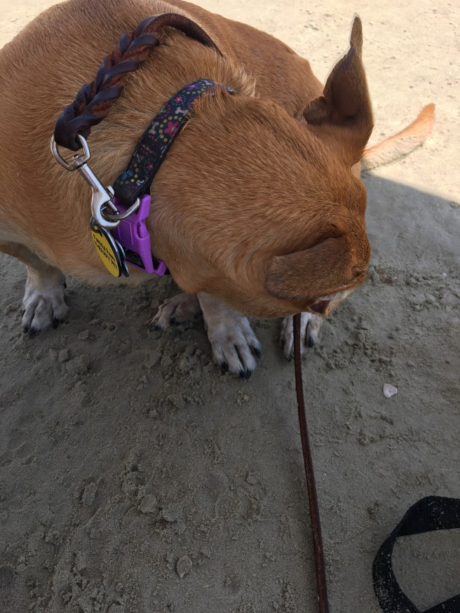I didn’t think she would get near the water but when we were walking she met another dog and started following it and actually got out in the water. She was not pleased about her mistake though. She immediately had to start getting the sand off her paws.