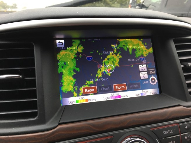 Some of the best things with the Pathfinder are the tech options I didn’t know I needed. Having navigation that does not drain my battery and data is going to be great for road trips as well as the Satellite radio. It also comes with 3 years SiriusXM Traffic and weather which was useful on this trip to see where the rain was while I was driving, without having to look it up on my phone.