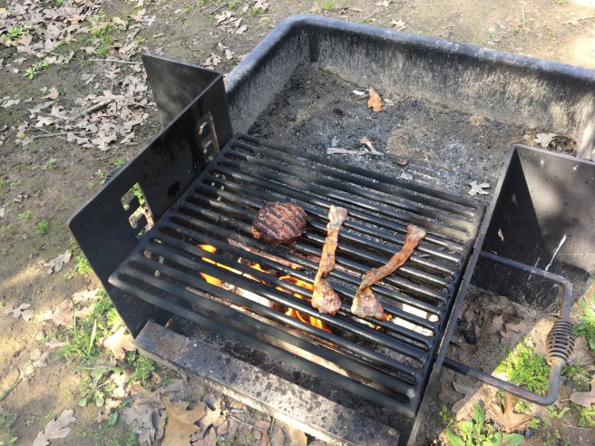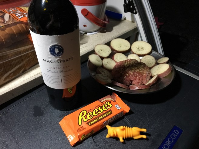 I didn’t really do much in the way of fancy food this time out, but I did make good use of the grill. I arrived Valentine’s day so I made sure to pack myself wine and chocolate.