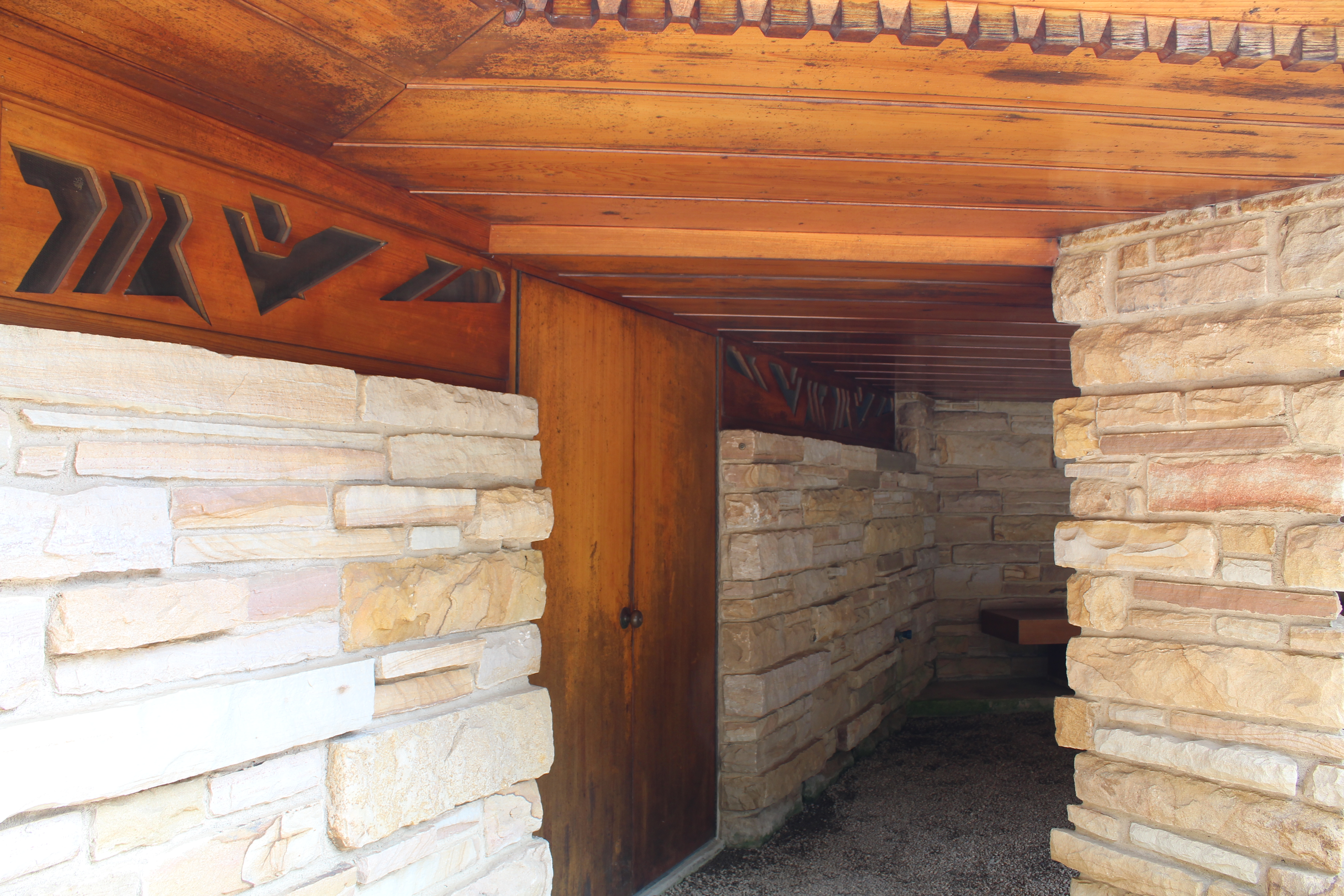 Off the dining room there is an exit to a back yard area. While this side of the roof does not have the skylights, it does have the intricate wood work showcased throughout the house. Although it was not working when I was there, there a small water feature outside the master bedroom that was no doubt placed at that spot to provide a calming ambiance for sleeping. An interesting note on the bedrooms is the size. There is no greater contrast in this house than between the main living area and sleeping areas. While the main living and dining areas are large, open and airy, to get to the bedrooms and bathroom you have to pass through a narrow hallway, with low ceilings, which sets the tone for the entire wing of the house. Learning about Wright’s life and beliefs, you find this stems from a believe in the importance of family and the home being the gathering place for family and friends. He believed that bedrooms and bathrooms were necessities but should not be designed to spend extensive amounts of time in them. The focus should be on the family areas of the house and making them a desirable place to stay and spend time.