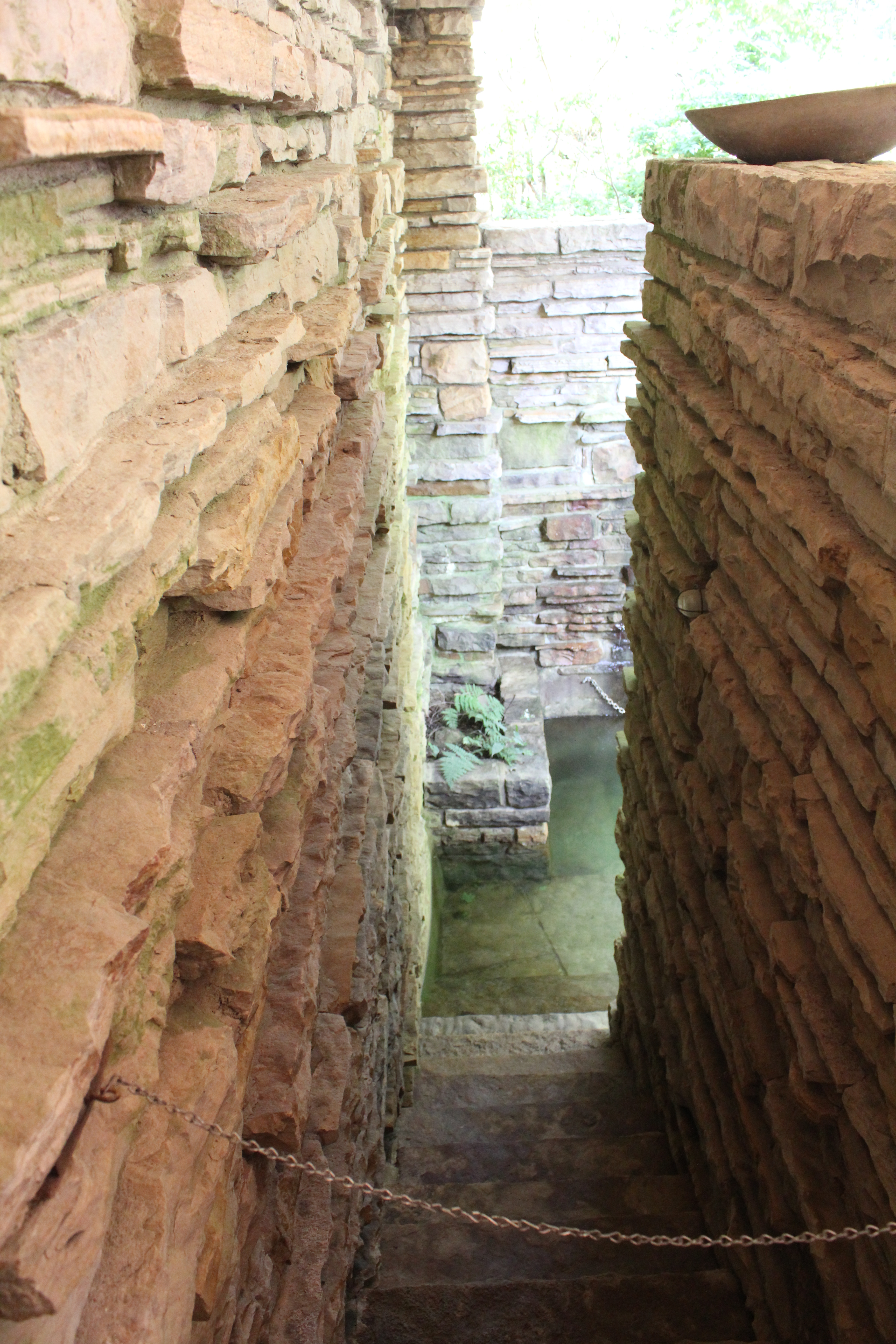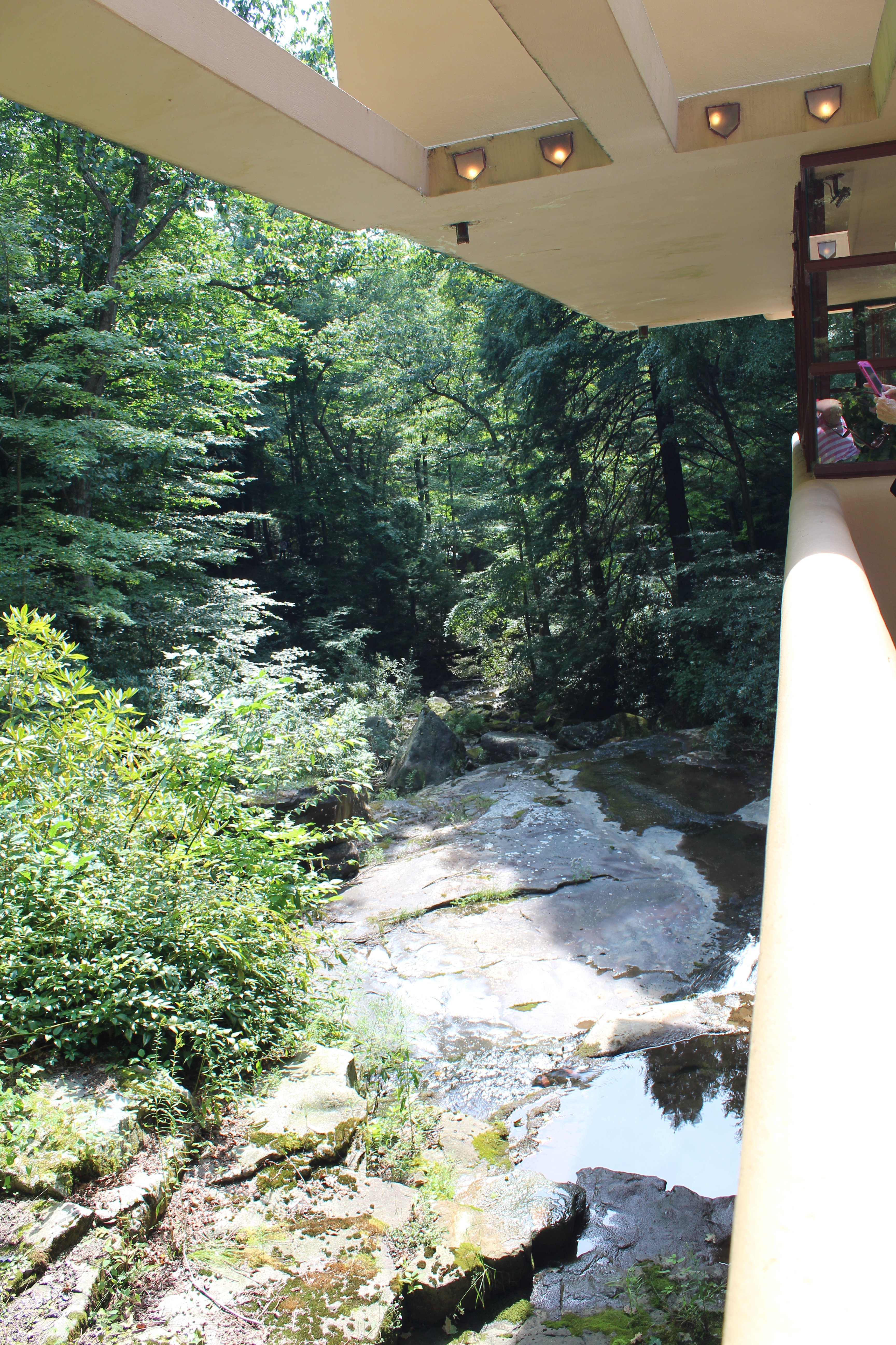 At the time I was there, you could not go inside due to Covid restrictions, but you could visit the numerous balconies around the house. It’s once you make it up onto them, that you really appreciate the genius that Frank Lloyd Wright was. When designing houses, he made them to sit on the site without making major changes to the landscape, but also in a way to utilize nature to cool and heat the home. This was seen in the locations of windows and stone, and how and when the sun would shine on them, and at Falling Water, he used the waterfall. The home was built in a way that the balconies and patios were placed over the edge of water itself. While it was probably done in a big part as showmanship, it also achieved the enviable goal at that time, of cooling off the house. I visited in September and when I made it to the balconies there was a noticeable coolness coming up from the waterfall. On the bottom floor there is actually a set of stairs that goes directly into the water and you could feel it get cooler, the closer you got to the water. Although I could not go inside, a tour guide pointed out another set of steps, you could see through the windows, going to the water from the main living space that could be opened to achieve the same goal.
