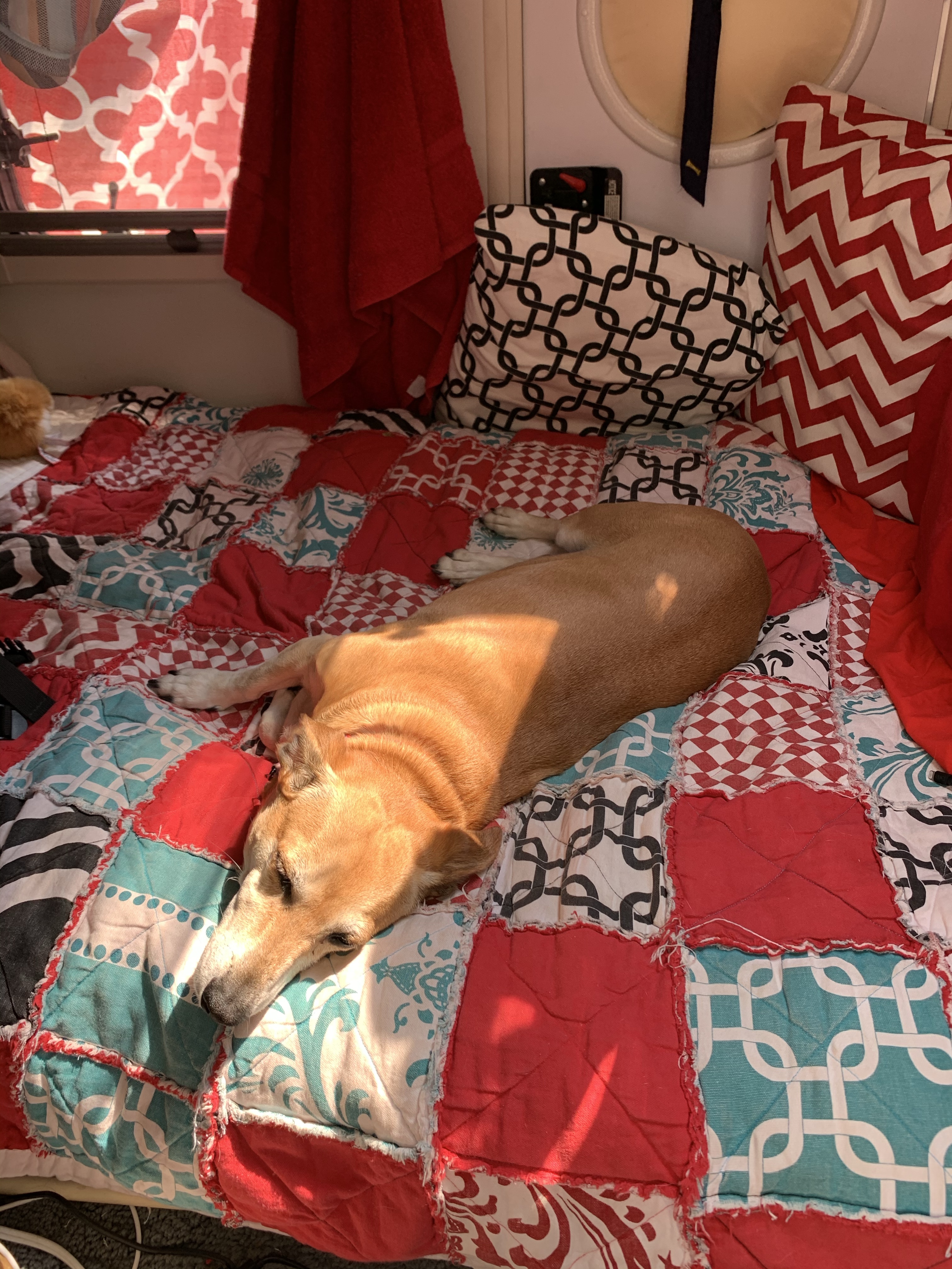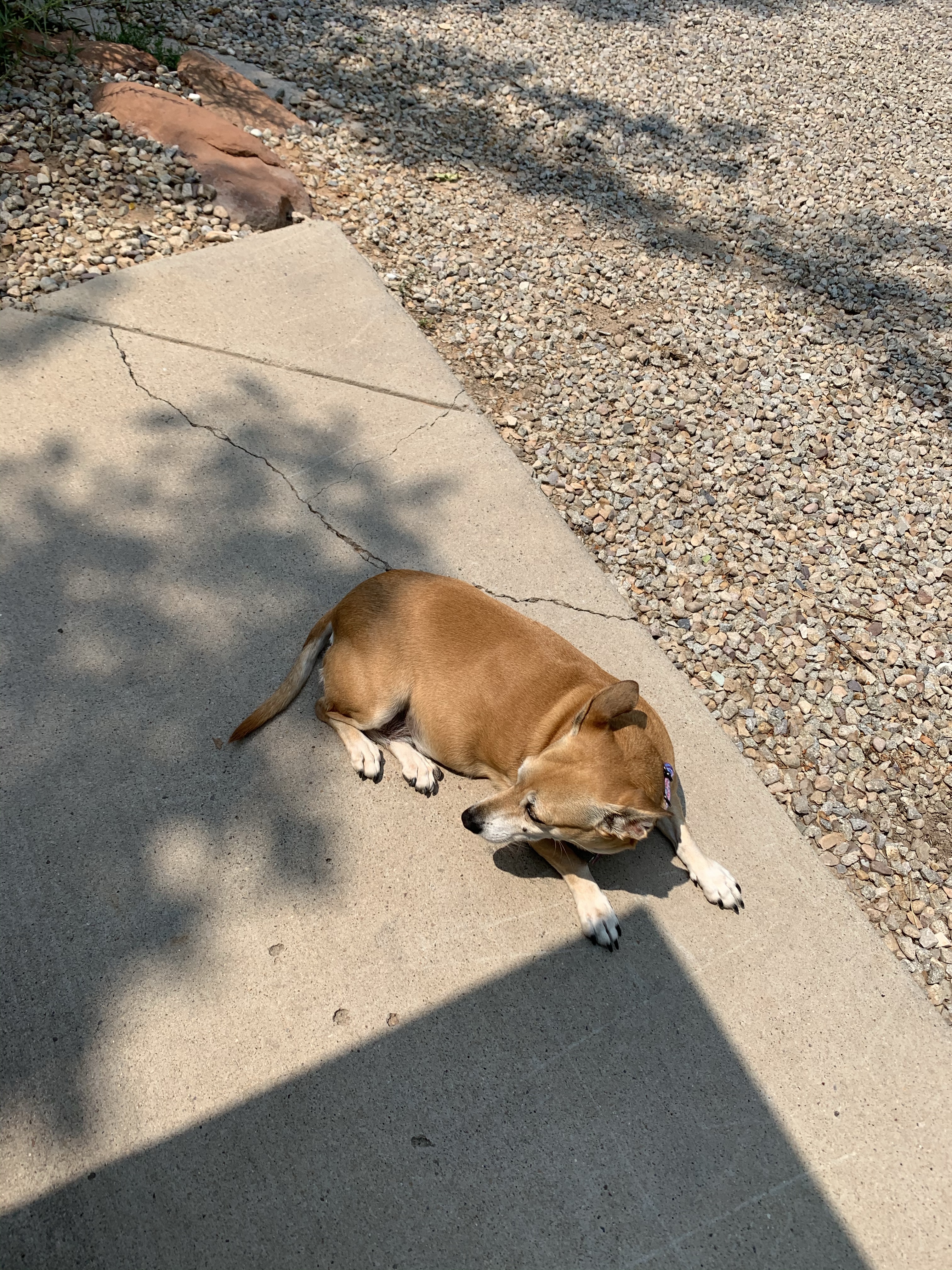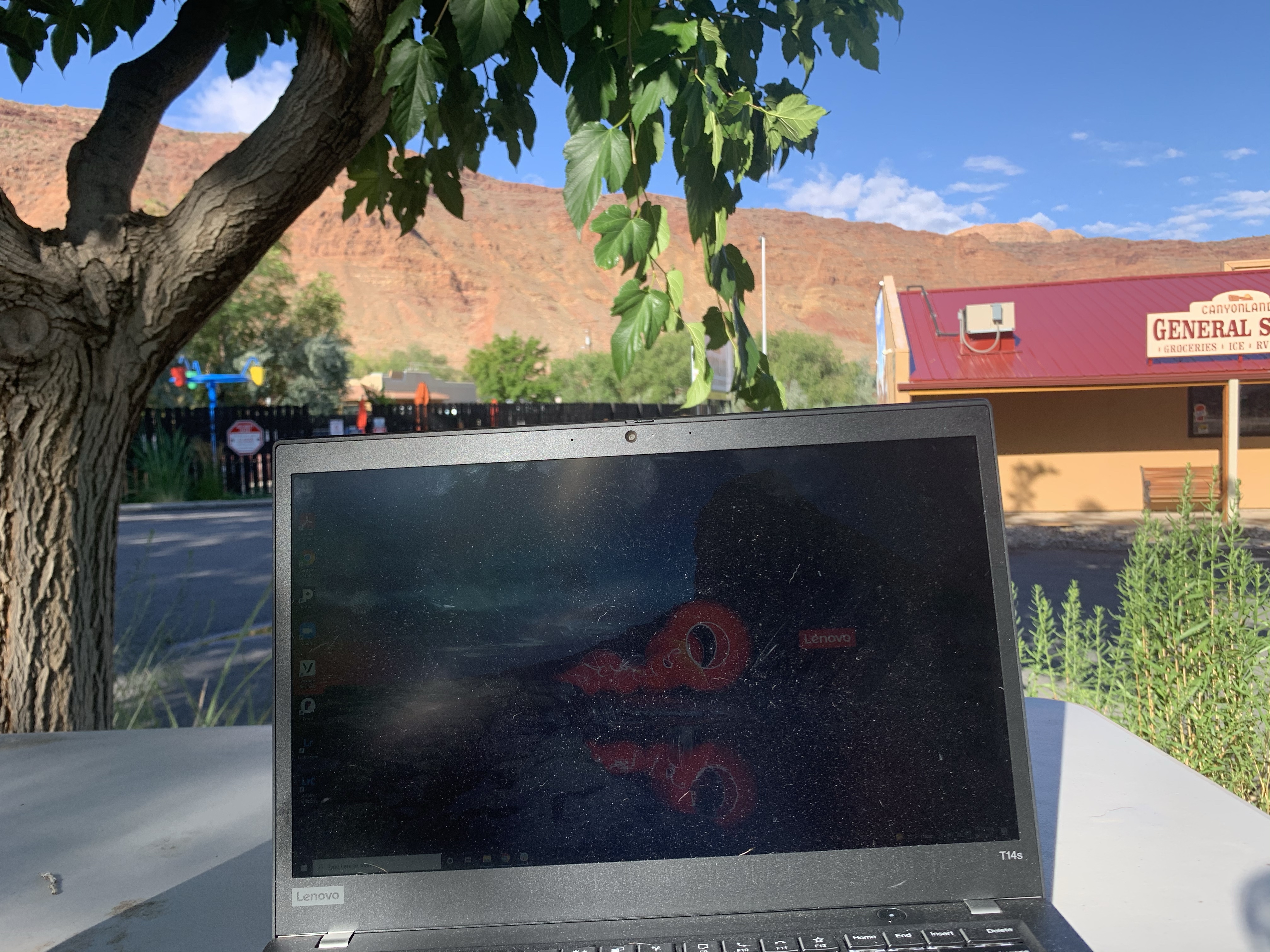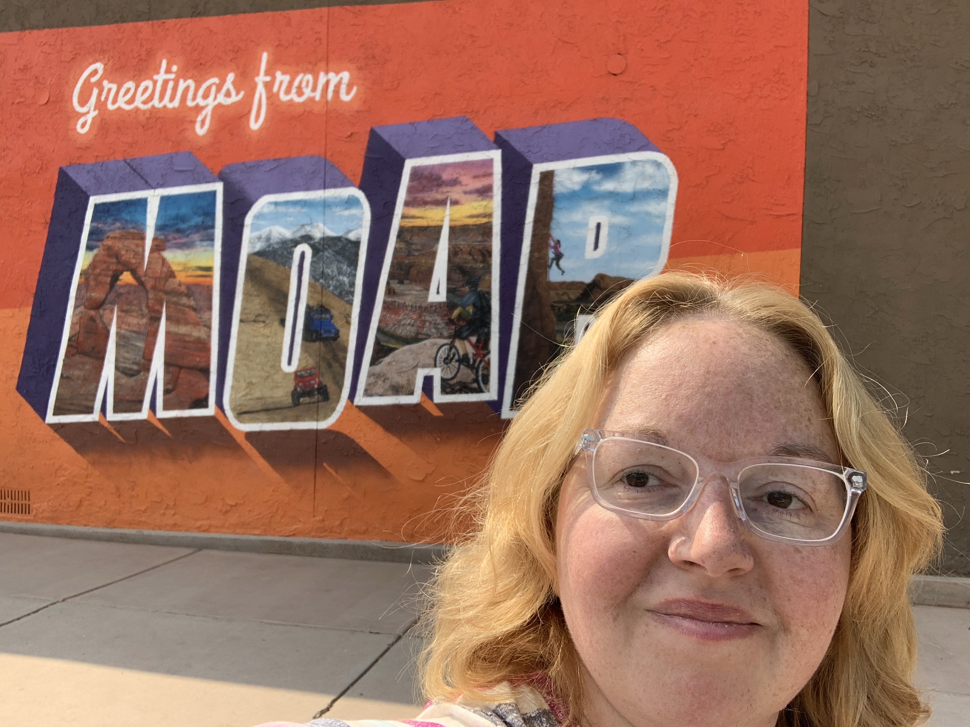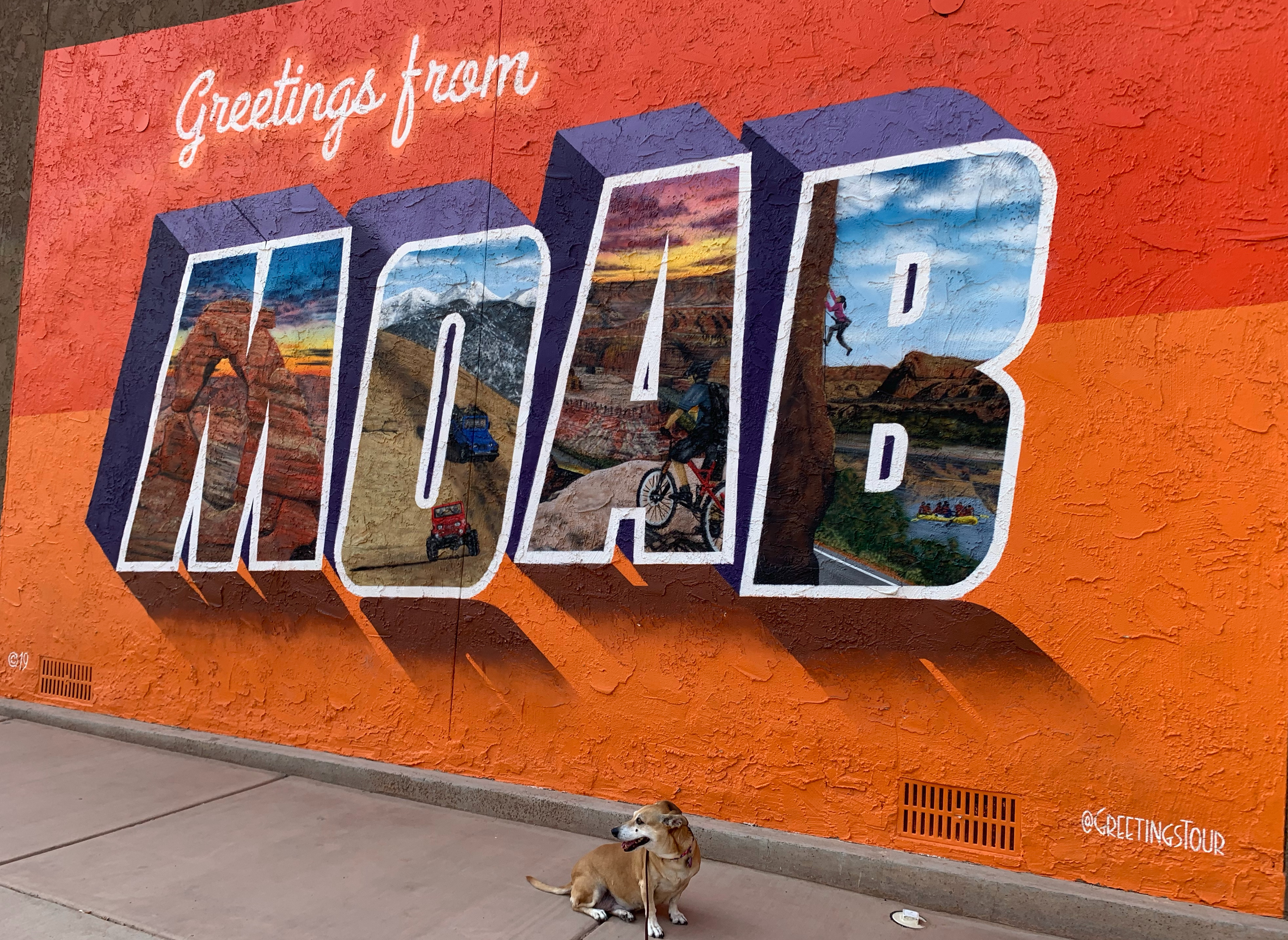 We had a nice site at the end of the park, close to the bathhouse and store, under a nice tree. Bella enjoyed the sun in the mornings while I worked at the picnic table. She also found some sun in the mornings on the concrete while I made breakfast. Like many places I went, a lot of places were still closed due to Covid so that also limited what we did, but we did make sure to get pictures in front of the Moab postcard sign.