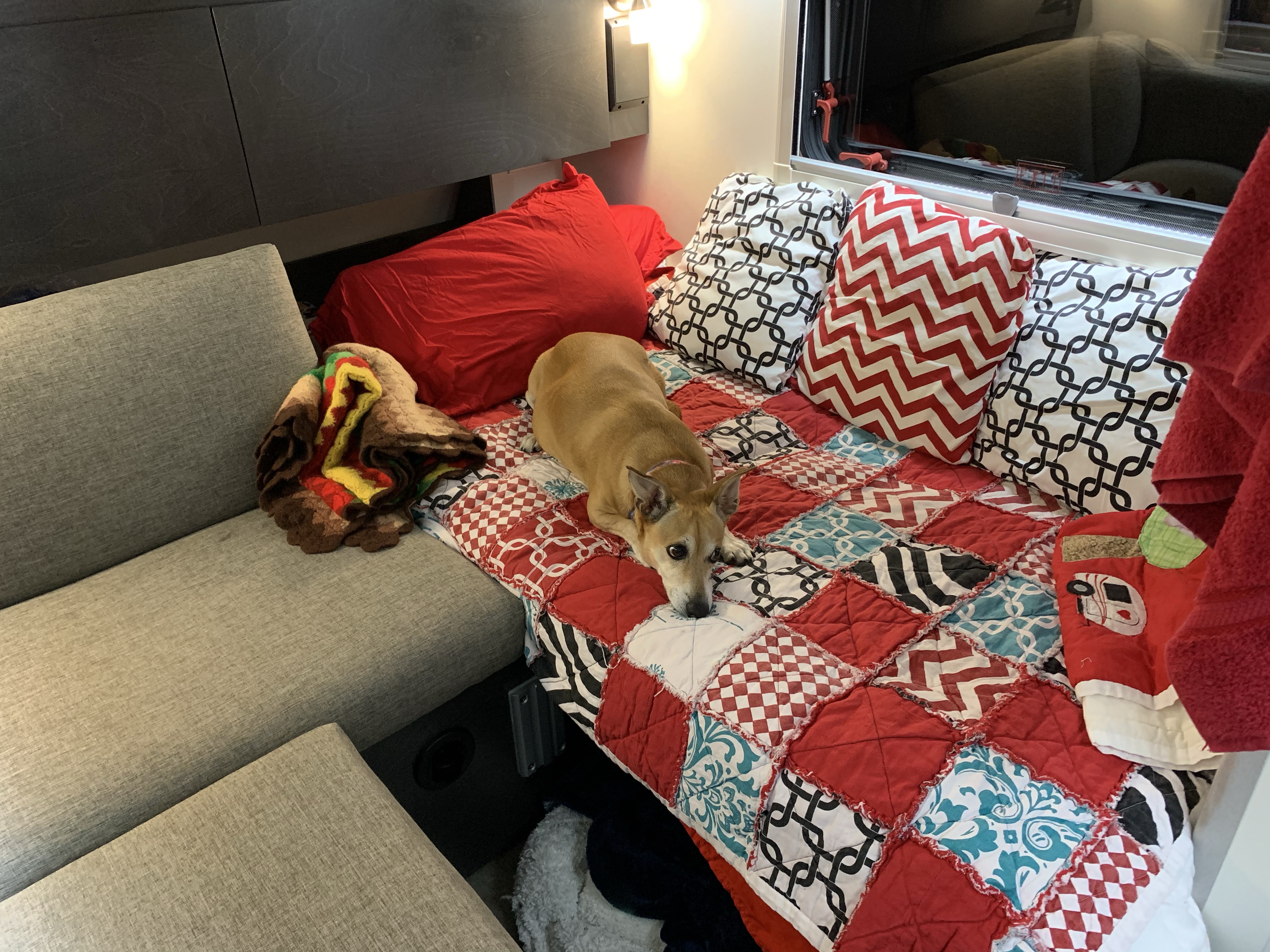 Overall me and Bella both are comfortable in the new Teardrop, as you can see she has already started making her own nests out of the bedding. I am looking forward to new adventures in 2022. Happy New Year to everyone and happy travels and adventures!