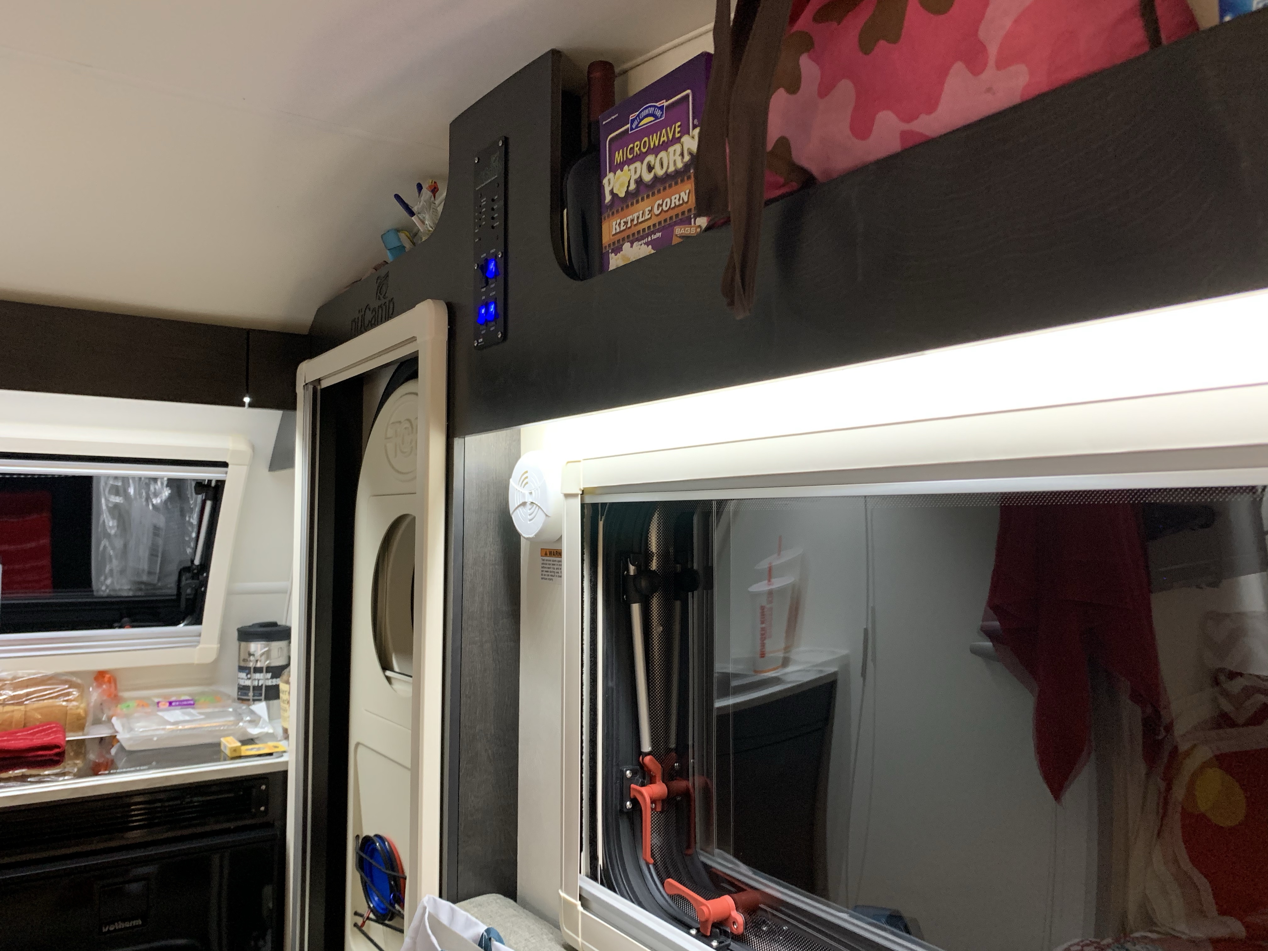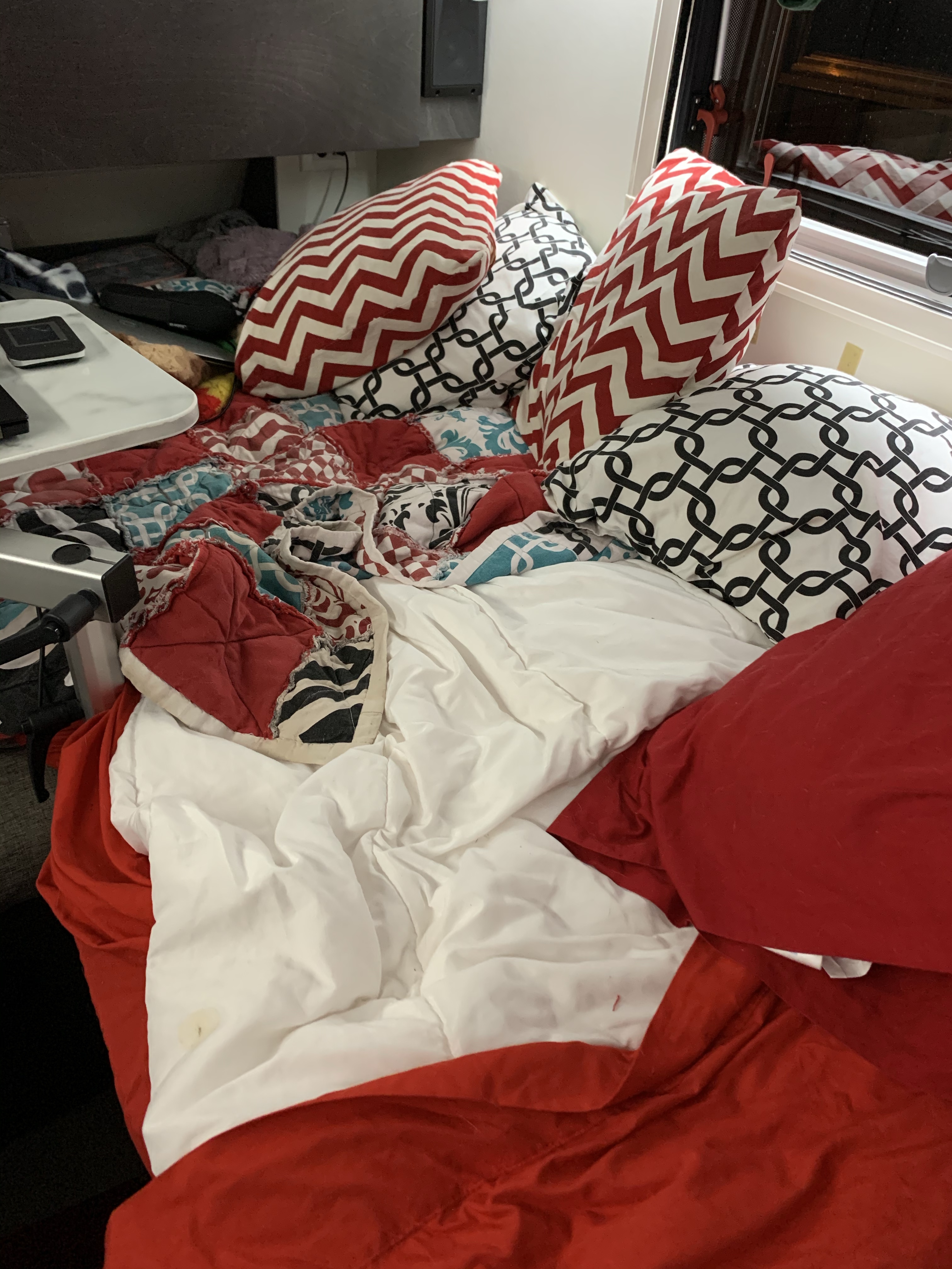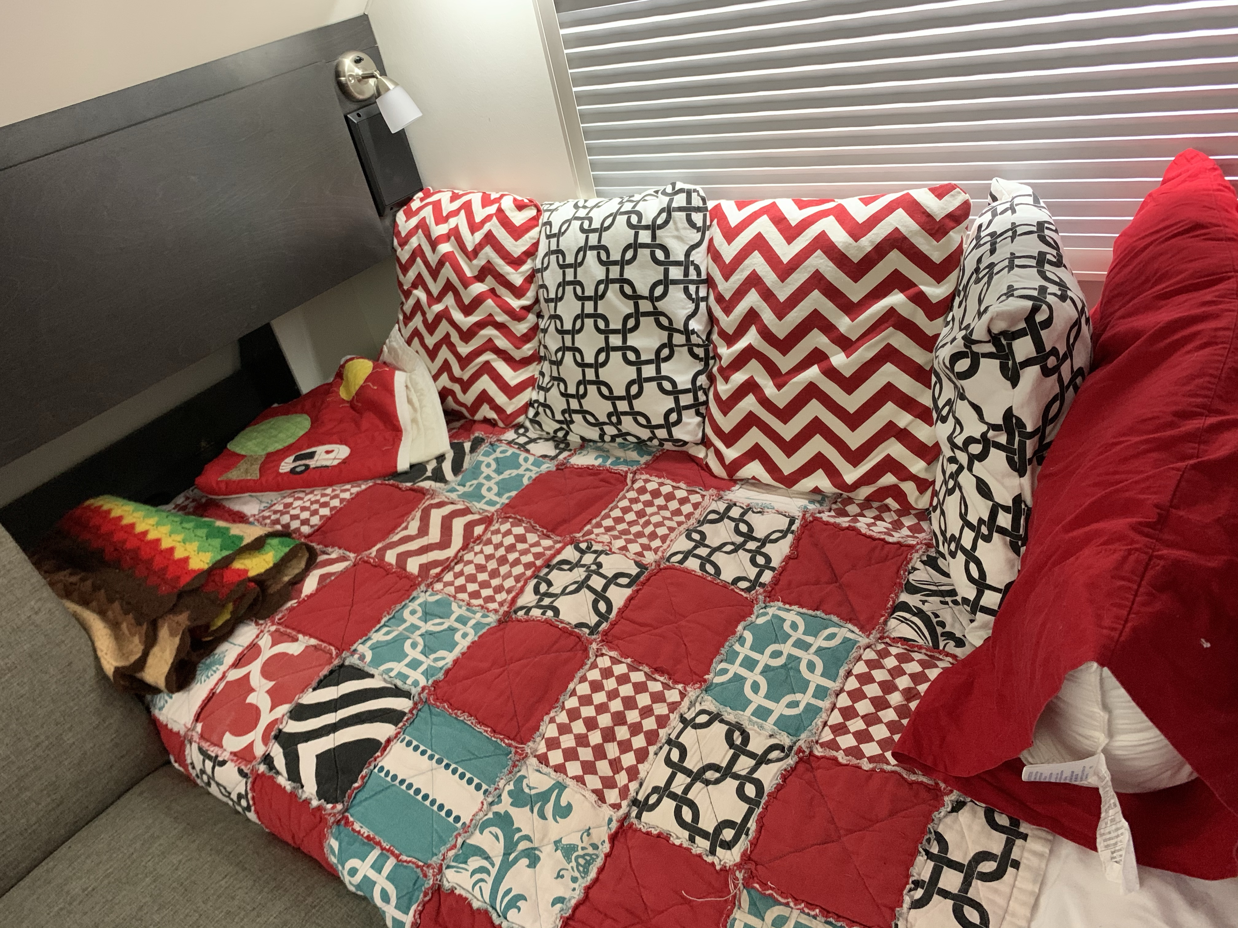 It became clear after that first weekend is that I had to change the end I put my head on. The way it’s set up my head was under the cabinet and I need to sleep with my head somewhat elevated to be able to breathe. That first weekend I felt kind of trapped under the back cabinet. My plan is to leave a bed made up and I also needed a topper because I could feel the separation of the cushions that make the bed. When I added the memory foam topper it raised the bed 2 inches so there was no way I could put my head at the cabinet end. Moving my head to the other means I can’t watch TV laying in bed but I don’t really do that anyway. The move also leaves the foot of the bed free to reach all the storage compartments behind the seats easier. The only real problem is that it’s designed to put your head at the other end so there’s a USB port and place for your phone. There is a USB plug under the other end of the seating, by the bathroom door, but it has made having a phone close to use as an alarm an issue. After I made this change, I stayed in it for 2 weeks in my parent’s yard to work our kinks and ended up leaving sticking between the mattress and wall. Not ideal, but I’ll figure out something.