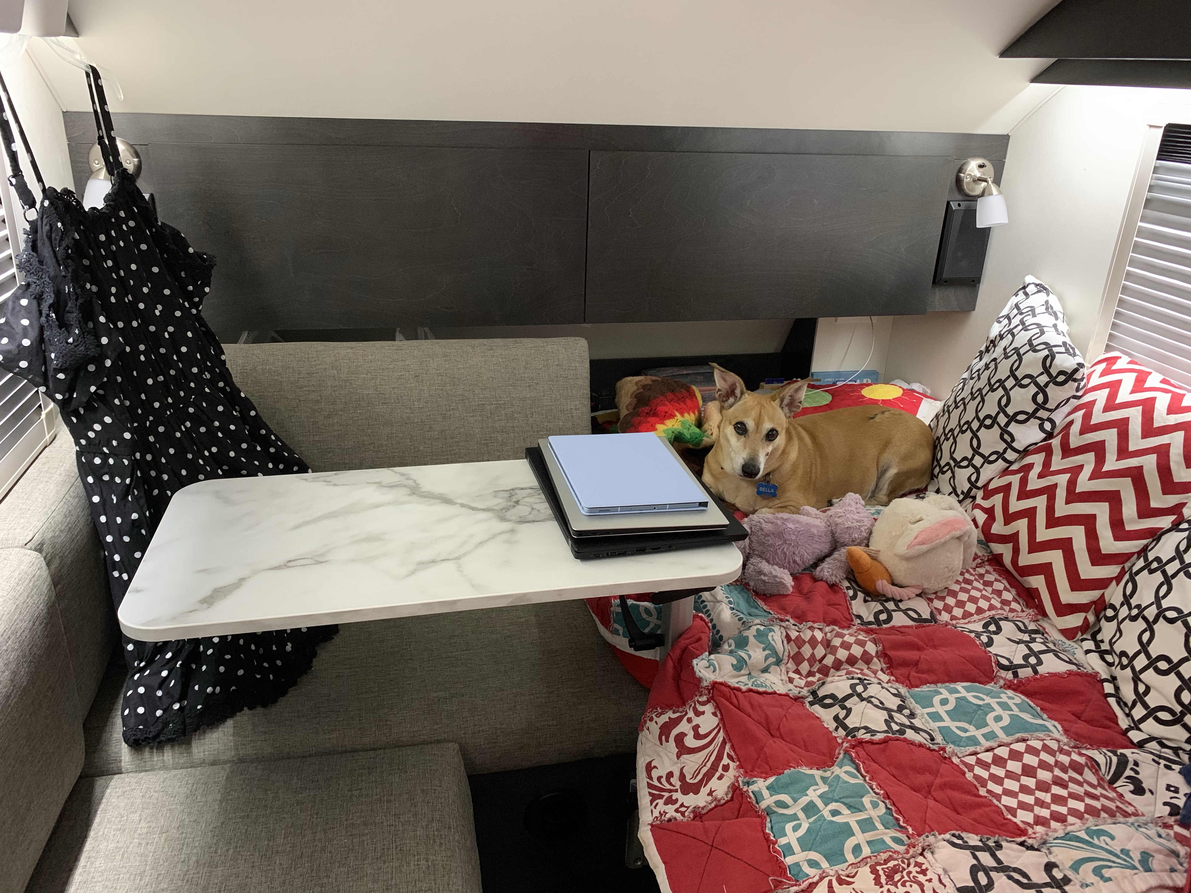 I also got the Lagun table installed during that time at my parents. You can see in the bottom right that I can have the bed made up and have a fully functional sitting area with table. This is the part of a new teardrop I am most excited about. I had figured out how to make the T@G work, but after 6 weeks, having to get up and make a bed and transform it into a somewhat useable office was a hassle. Plus, I have lost track of the times food ended up spilled in my bed because I had nowhere to sit and eat. I love the Lagun table because it has 2 pivots points and spins all the way around easily, no matter where I sit. So it can be a desk and table as well as nightstand.