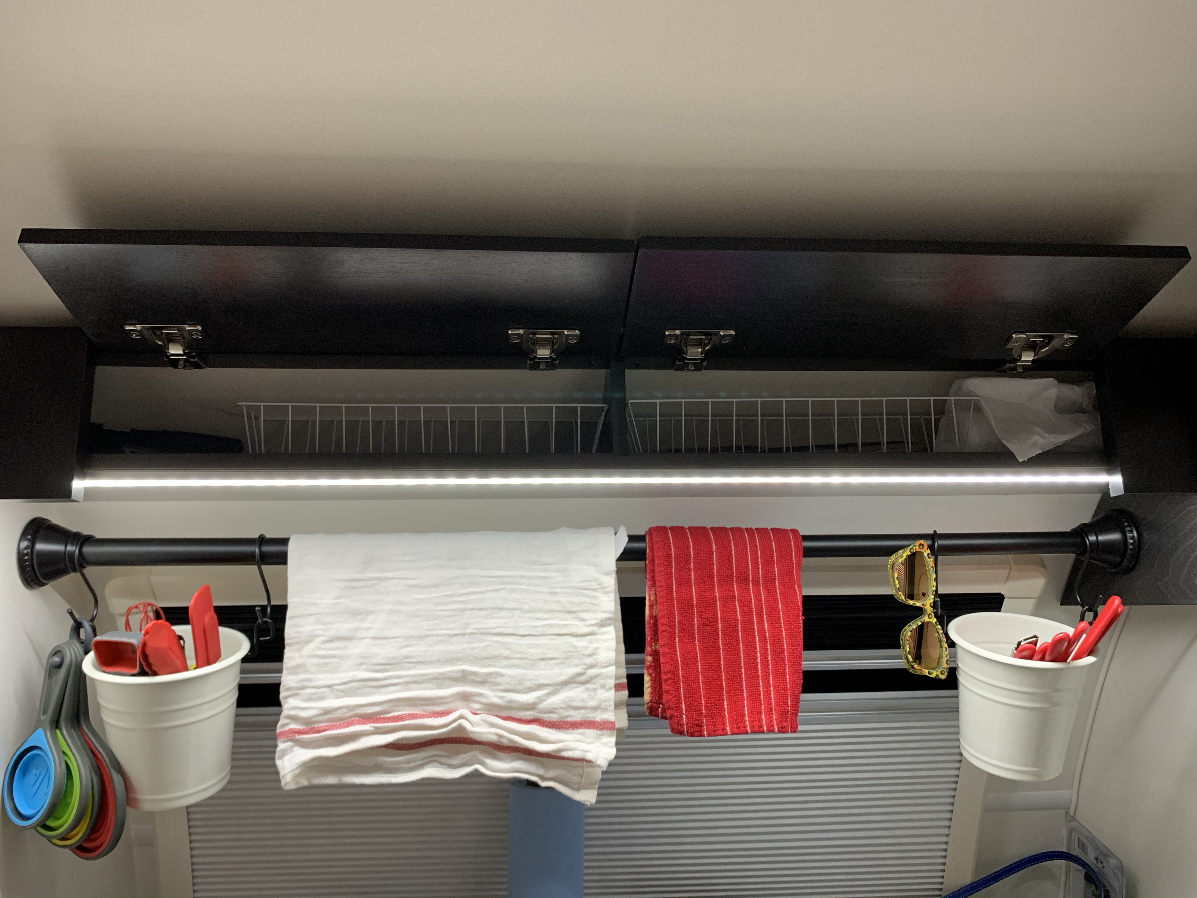 As I said, the initial setup was not great, but I’m putting them in this post to show the difference a few organizational items can make. But even before adding more, the kitchen is a lot more functional than the T@G with a lot of cabinet space. One thing I also love about the T@B is the build in storage compartments all around the top.