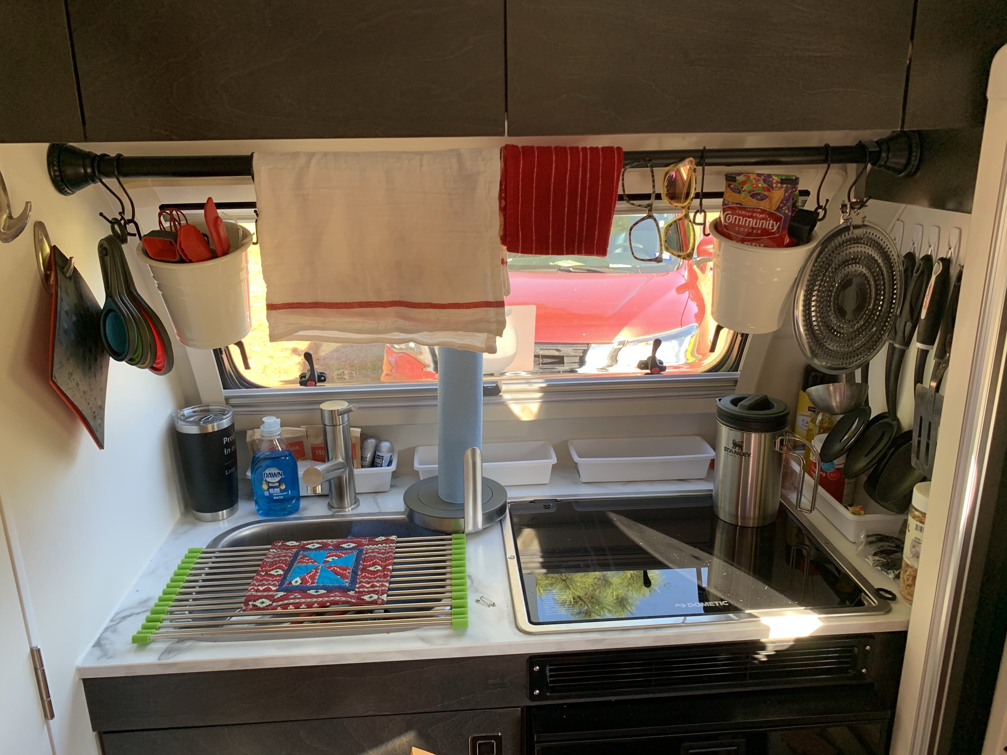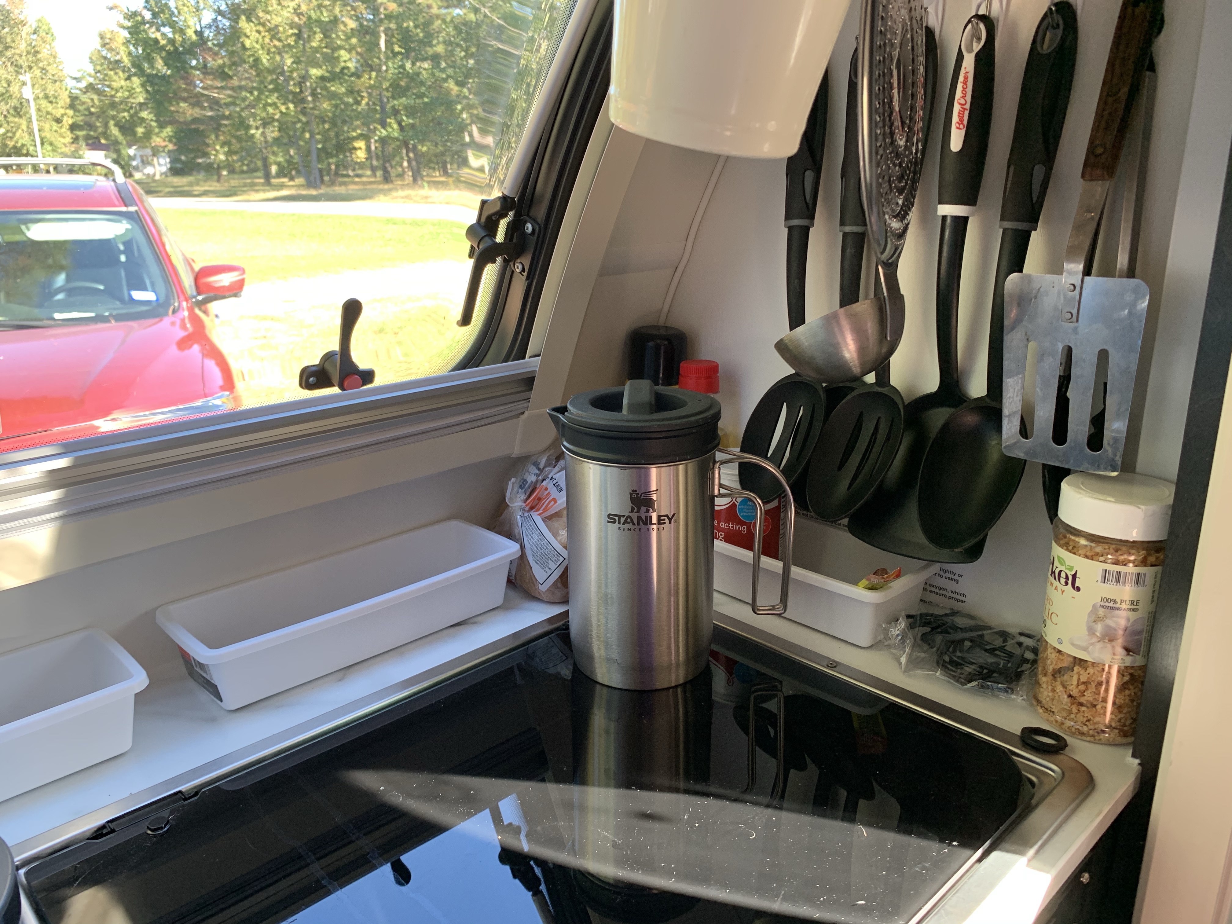 Organizing the kitchen turned out to be challenge. I tried to order some things from Amazon but they didn’t fit. I ended up finding trays that fit in the top cabinets at Dollar Tree as wells as ones narrow enough to fit around the stove and sink with grippy feet on the bottom. I was able to repurpose the towel rack I had across the stargazer window in the T@G as a towel rack as well as a place to hang my organizing buckets I was using in the T@G. My dish drainer from the T@G also works over the sink to give me more counter space while still being able to use the sink. Most of what I had in the T@G works well in the T@B, the only thing I needed to buy was a way to make coffee. I really don’t have a place for the breakfast center and I want to move to an Omnia oven so all my cooking can be done off grid, so I needed a way to make coffee off-grid too. I had actually been looking for a better off-grid option already because the percolating pot really doesn’t work unless you make a full pot and I don’t need that much coffee. I found a great option thanks to a fellow tagger at the photography workshop I went to. It’s a press that is made for camping so it can be put directly over the fire. If you are interested, here is the link on Amazon. https://www.amazon.com/gp/product/B07L6MLC6J/ref=ppx_yo_dt_b_search_asin_title?ie=UTF8&psc=1