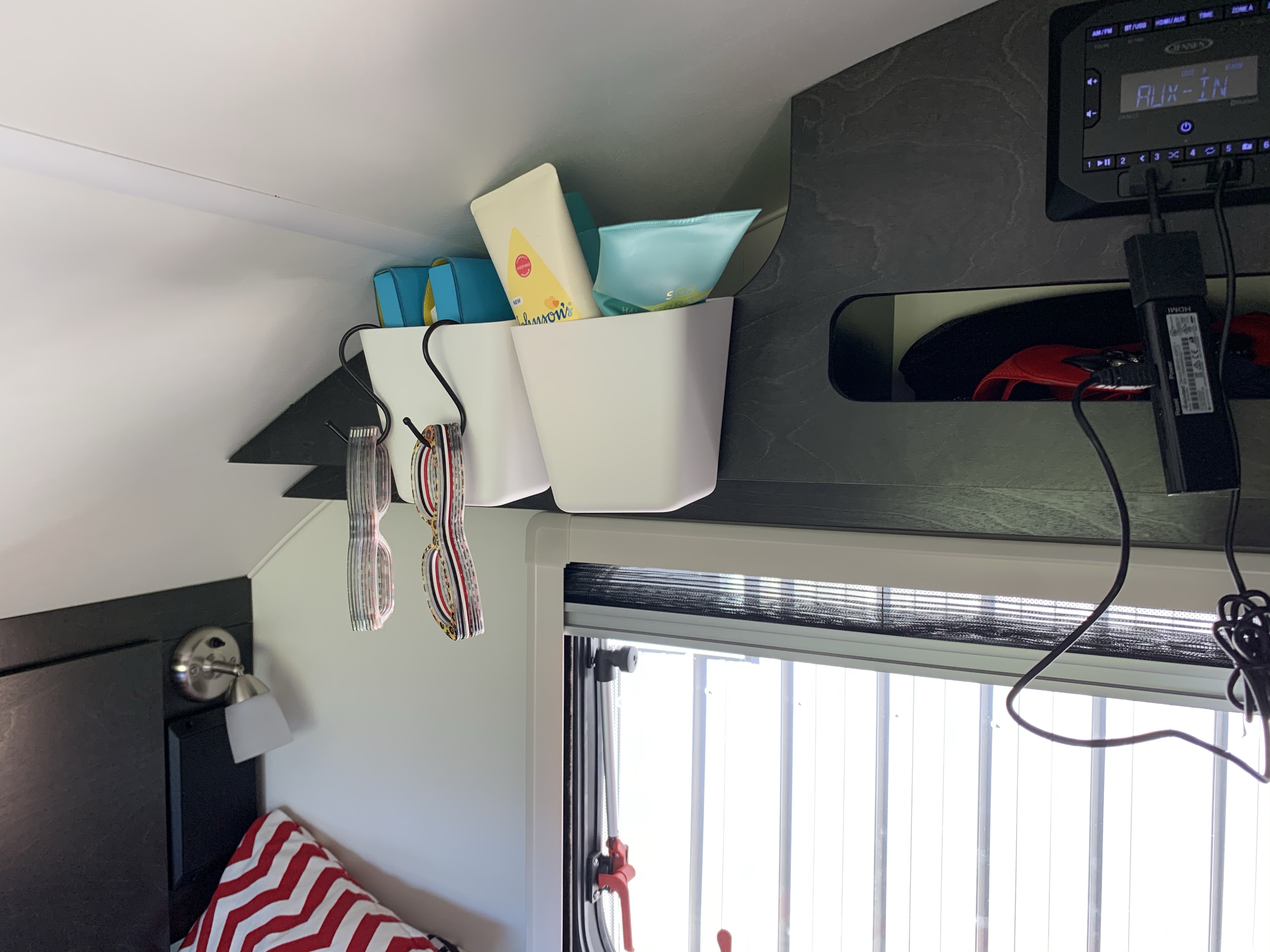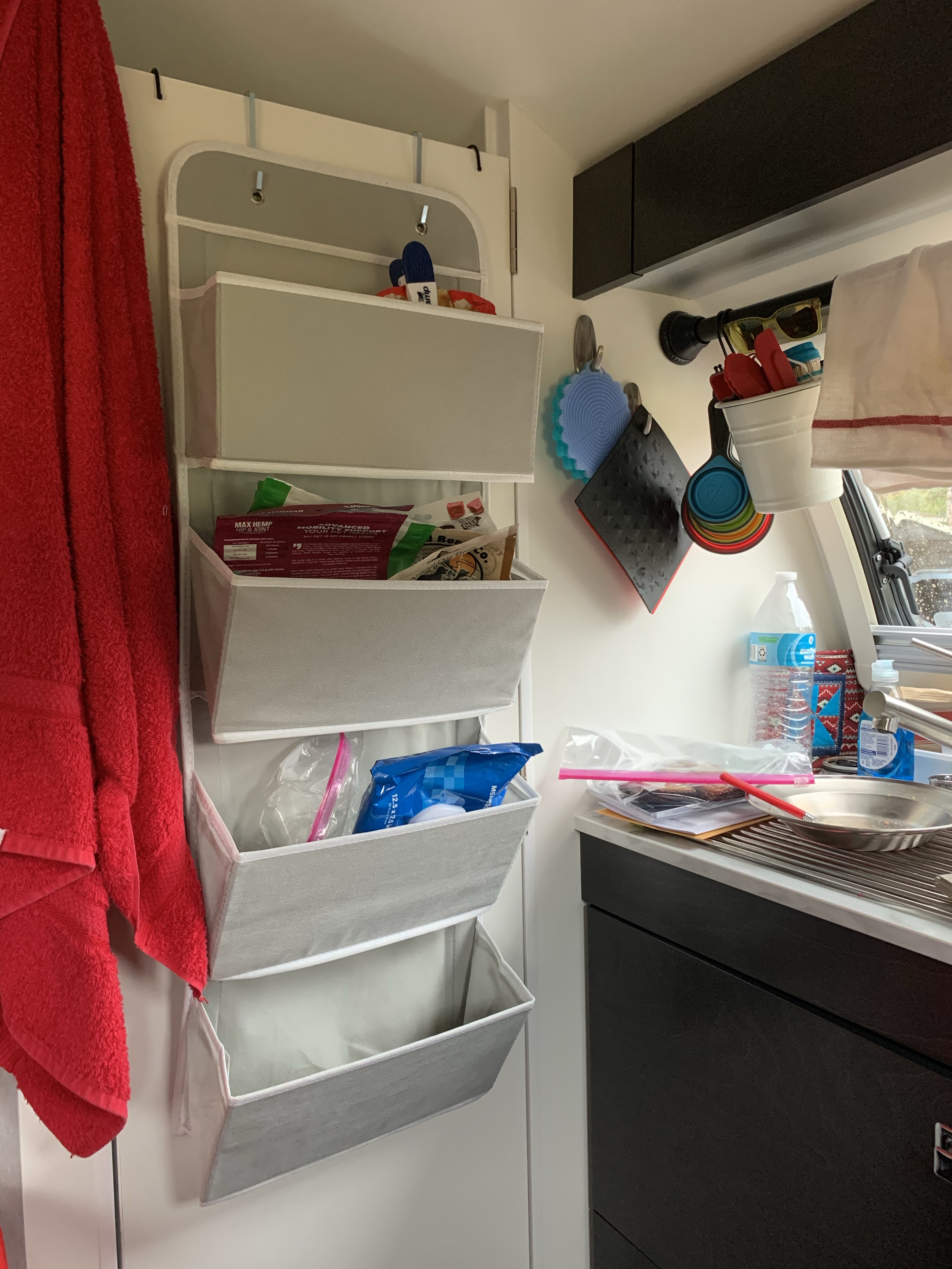 Although it has great storage, if I am going to be living in it for a month or more, I needed better ways to pack and organize everything I will need. The white bins are staple among T@B owners and I completely understand why, they are great! I can still easily access the built in cubby behind it and find things much easier by giving them their own bin. You can get the white bins from Ikea but I actually found them from Amazon. https://www.amazon.com/gp/product/B08SLP96NS/ref=ppx_yo_dt_b_search_asin_title?ie=UTF8&psc=1