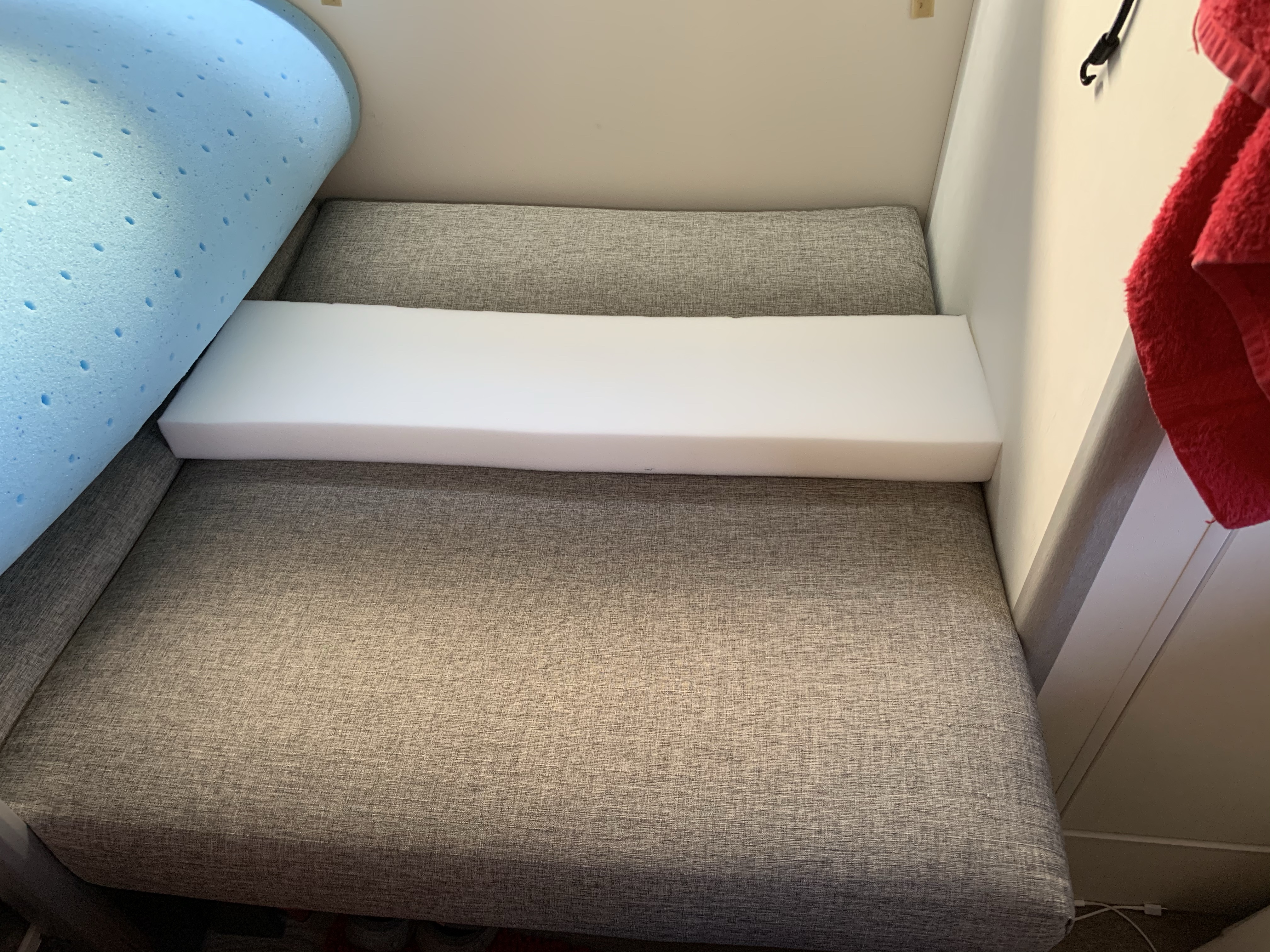 I did have to make one, somewhat of a modification after a week in it. While I added a mattress topper to make the bed more comfortable, I was still having issues from moving my head to the other end. The bed is made from the dinette cushions so it’s not one continuous piece, which was causing a couple issues. First, the cushions from the back that lays down are permanently attached to the back and are a little firmer and fuller than the ones that were velcro’d on the sides. If you are putting your head at the end they intend it’s not a big deal, but I felt like from my waist up was sinking in more, which is really uncomfortable and made it impossible to lay on my side. On top of that, the way the cushions were made they are contoured around the edges, so there was what felt like a hole where the they met and I kept sinking into the gap between the two side ones as well. To fix this I found a 2″ piece of super firm foam and cut pieces to go under the memory foam topper. I started with one piece to go across the long section of the side cushions to add support along the contoured edges. Then I cut a piece to just cover the entire end where I’m putting my head, over the entire section with loose cushions. The combination was just what I needed to make the surface firmer and more even. There is a slight slope at the foot now, but that is ok. After making this change I slept much better.